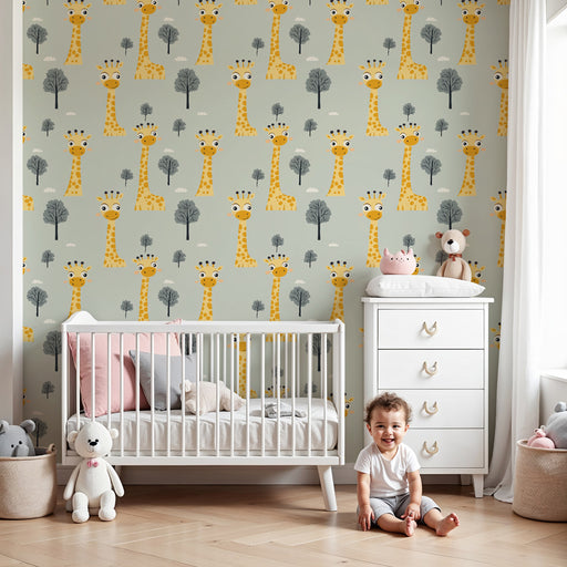 KidsWallLeve o seu filho para um mundo alegre com este papel de parede para quarto de criança decorado com girafas encantadoras com expressões amigáveis. E...