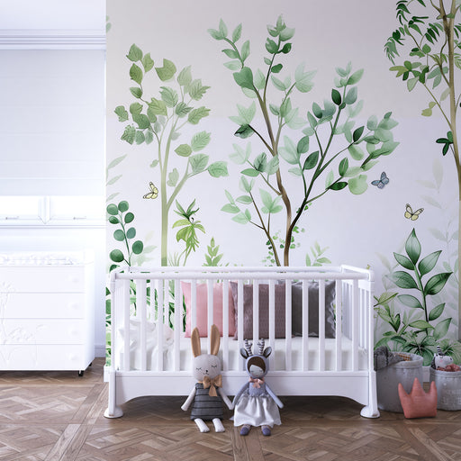 Mostrar todos os detalhesPapel de parede criança | Floresta encantada com borboletas e folhagem verdejante