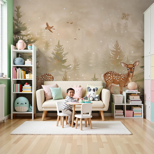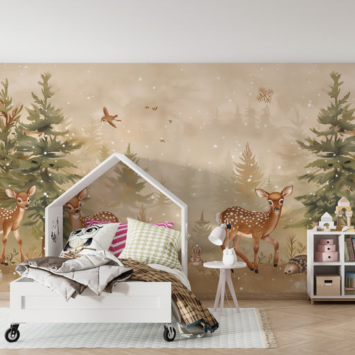 Mostrar todos os detalhesPapel de parede criança | Floresta encantada com cervos brincalhões e neve suave