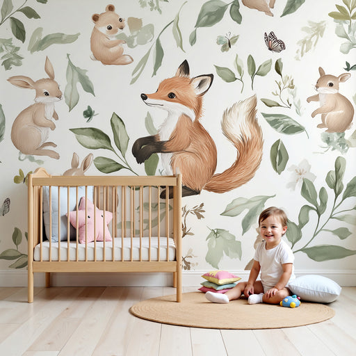 Mostrar todos os detalhesPapel de parede criança | Floresta encantada com animais brincalhões e ramos delicados
