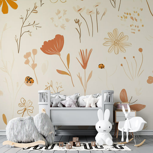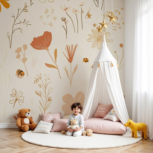 Mostrar todos os detalhesPapel de parede criança | Jardim florido com borboletas e papoilas em tons de terracota