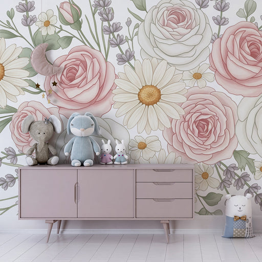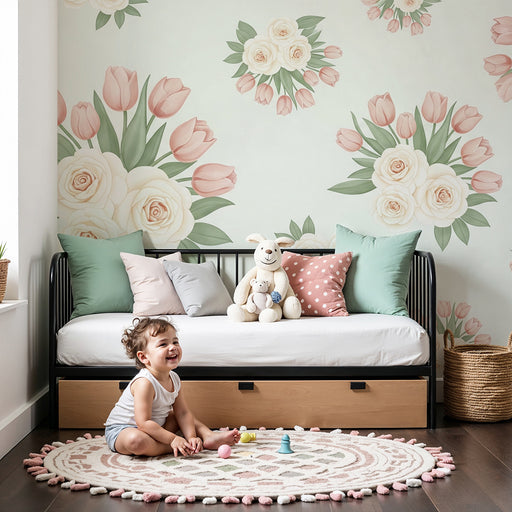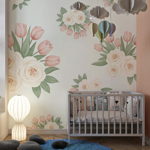KidsWallRenovele o quarto do seu bebé num ninho adorável com este papel de parede para bebé adornado com belos buquês de rosas e tulipas. As tonalidades su...