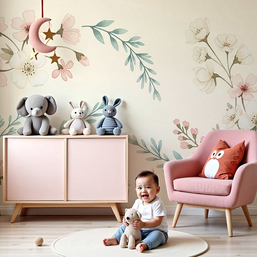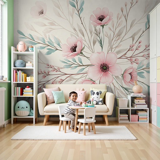 KidsWallRedecore o quarto do seu bebé com este papel de parede para bebé adornado com belas flores e folhagem. As flores cor-de-rosa desabrocham no meio de...