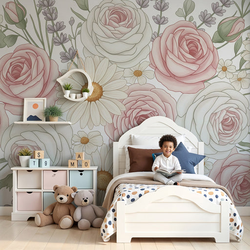 KidsWallRenovele o quarto do seu bebé num casulo fofo com este papel de parede para bebé adornado com belas flores e rosas pastel. Os delicados padrões flo...