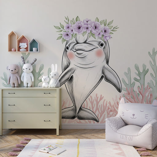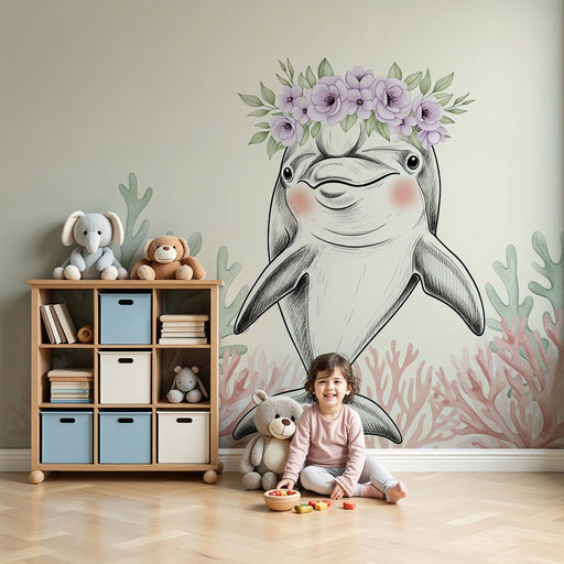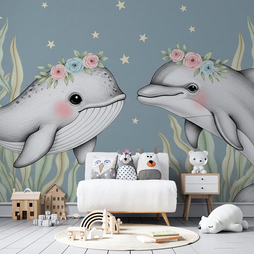 KidsWallMergulhe num encantador universo marinho com este papel de parede para bebê apresentando golfinhos e baleias adornados com coroas de flores delicad...