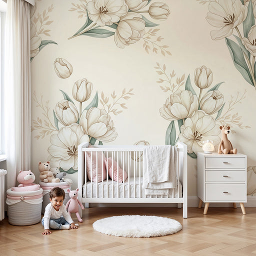 Mostrar todos os detalhesPapel de parede quarto bebê | Tulipas suaves e natureza calmante