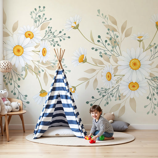 KidsWallTraga um toque de suavidade e frescura ao quarto do seu bebé com este papel de parede para bebé adornado com margaridas magníficas. As flores branc...