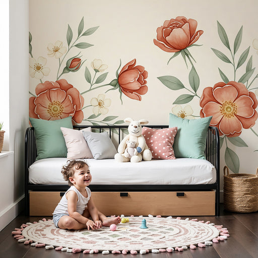 KidsWallRedecore o quarto do seu bebé com este papel de parede para bebé adornado com belas peónias. As flores, em tons suaves de rosa, creme e vermelho, f...