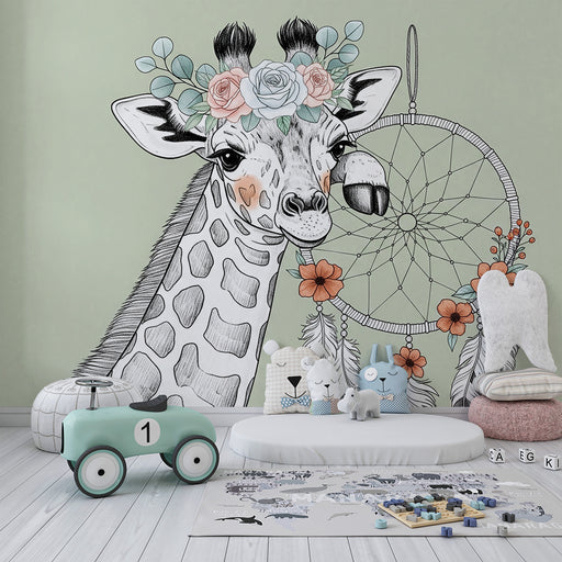 KidsWallRenovele o quarto do seu bebé num ninho fofo com este papel de parede para bebê representando uma adorável girafa adornada com uma coroa de flores ...