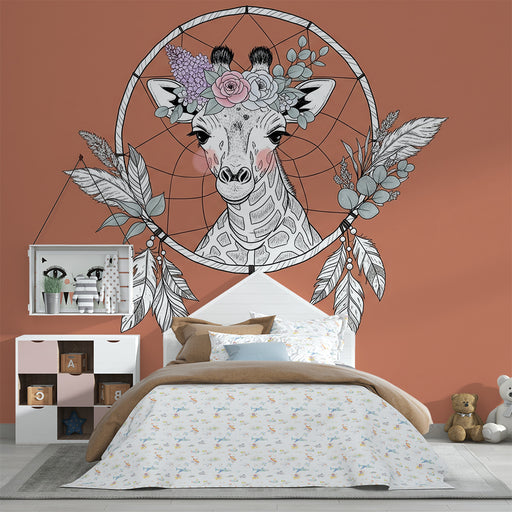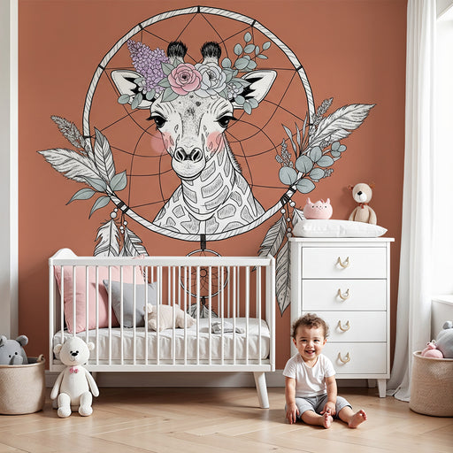 Mostrar todos os detalhesPapel de parede quarto bebê | Girafa boêmia com apanhador de sonhos