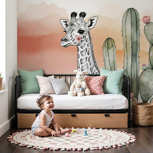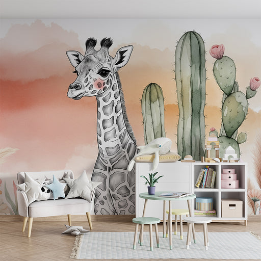 KidsWallTransforme o quarto do seu bebé num espaço de tranquilidade com este papel de parede para bebé ilustrando uma girafa encantadora cercada por cactos...