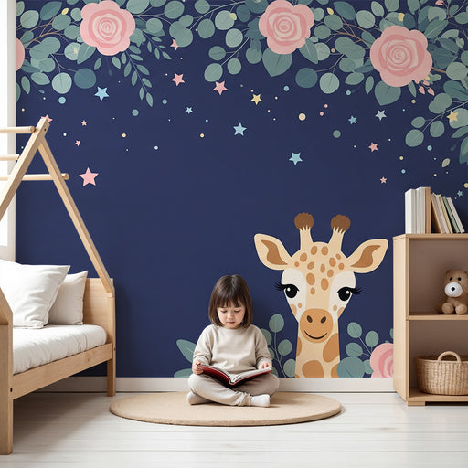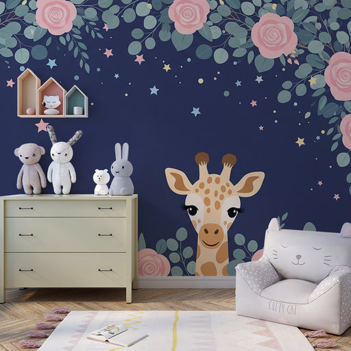 KidsWallEmbeleze o quarto do seu bebé com este papel de parede para bebê adornado com uma girafa adorável rodeada por rosas delicadas. Num fundo azul noite...