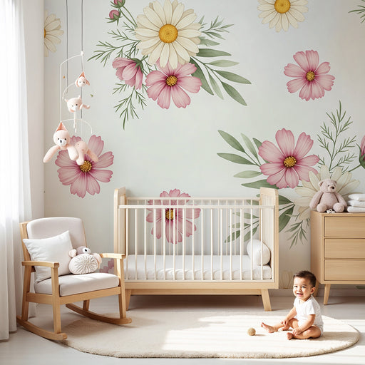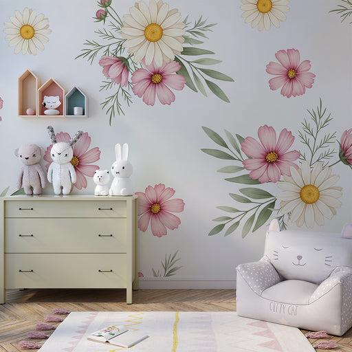 KidsWallRedecore o quarto do seu bebé com este papel de parede para bebé adornado com delicadas flores. Margaridas brancas e cosmos cor-de-rosa dançam grac...