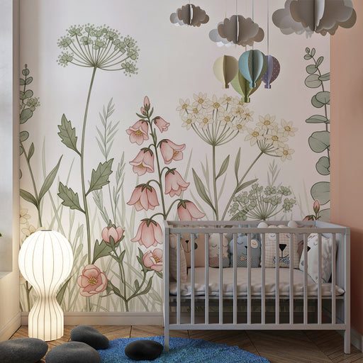 Mostrar todos os detalhesPapel de parede quarto bebê | Flores selvagens em fundo pastel