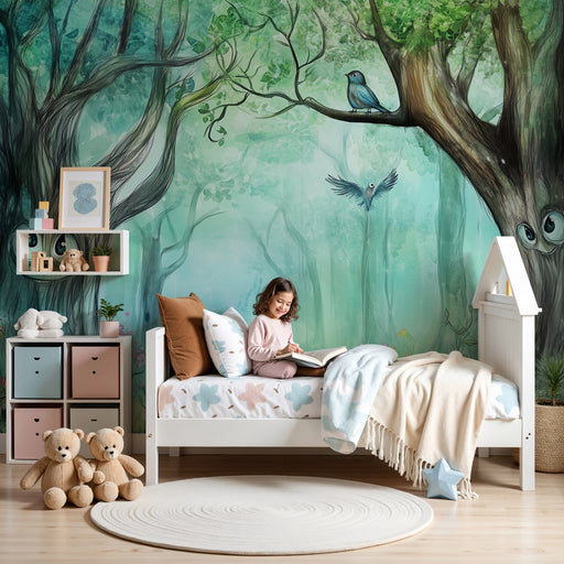Mostrar todos os detalhesPapel de parede criança | Floresta encantada com árvores sorridentes e pássaros brincalhões