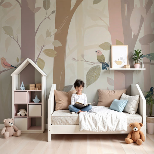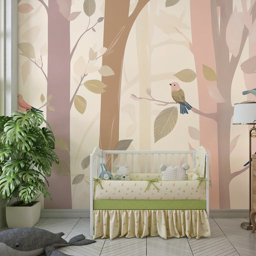 Mostrar todos os detalhesPapel de parede criança | Floresta encantada com pássaros coloridos e árvores pastel