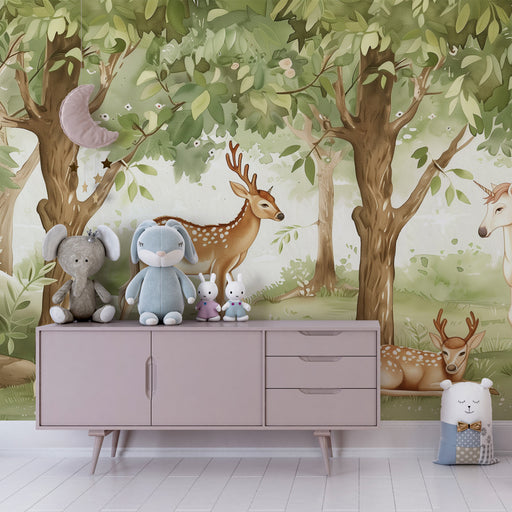 Mostrar todos os detalhesPapel de parede criança | Floresta verdejante com corças e unicórnio majestoso