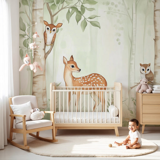 Mostrar todos os detalhesPapel de parede quarto bebê | Floresta encantada com corças e corujas