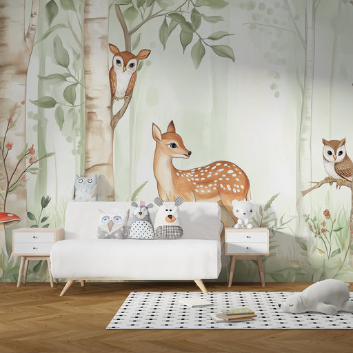 Mostrar todos os detalhesPapel de parede criança | Floresta encantada com corças e corujas
