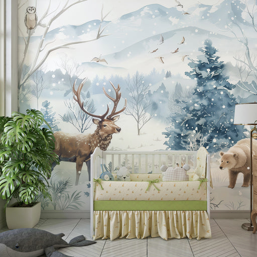 Mostrar todos os detalhesPapel de parede quarto bebê | Floresta de inverno com cervos e animais suaves