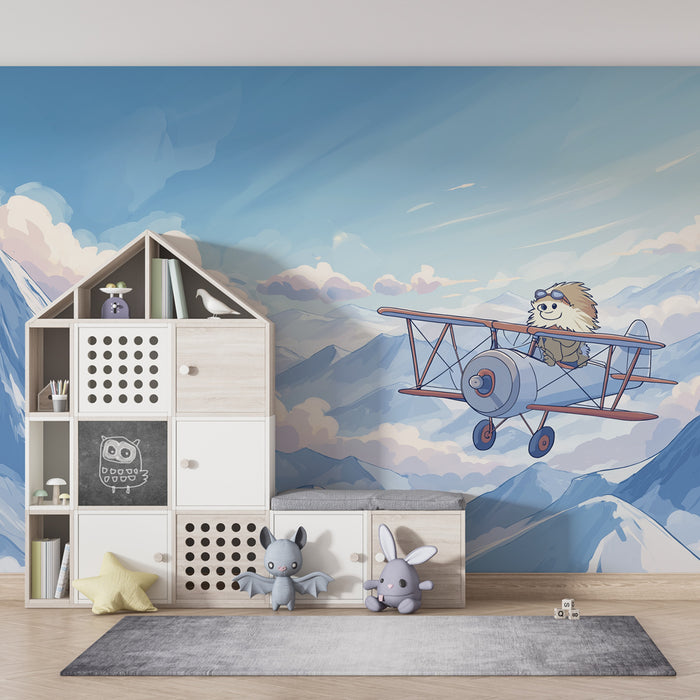 Embarque numa viagem imaginária com este papel de parede para criança cativante, apresentando um divertido ouriço no comando do seu avião vintage. Voando sobre majestosas montanhas, este pequeno explorador faz-nos sonhar com aventuras num céu limpo e ensolarado.