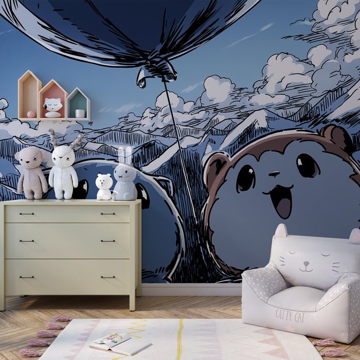 Desperte o espírito de aventura do seu filho com este papel de parede para crianças que ilustra dois adoráveis personagens em balão sobre picos nevados. O céu azul e as nuvens fofas criam um ambiente alegre onde a imaginação pode voar, promovendo os sonhos de exploração.
