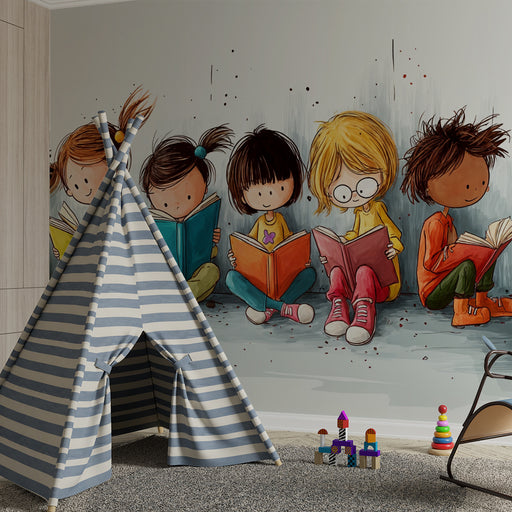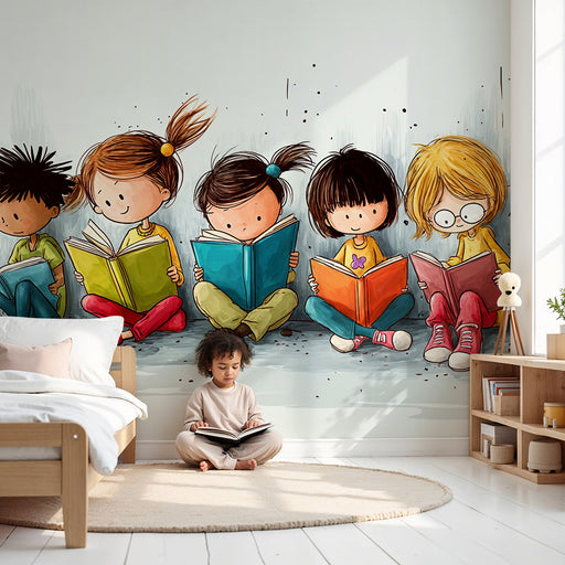 KidsWallEste ilustração de papel de parede representando crianças a ler é perfeita para adicionar um toque de fantasia e cor a um quarto de criança ou sala...