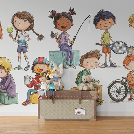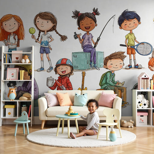 KidsWallEste papel de parede criança apresenta um grupo de crianças envolvidas em várias atividades divertidas e criativas. Perfeito para um quarto de cria...