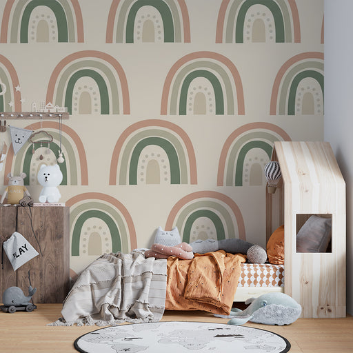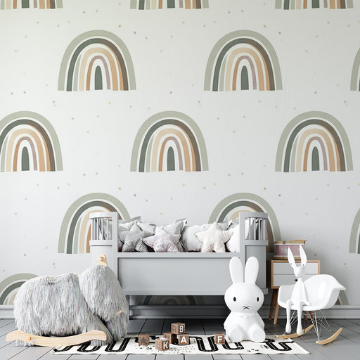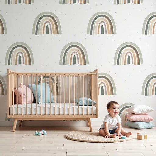 KidsWallMergulhe num universo relaxante e acolhedor com este papel de parede quarto bebê, onde um arco-íris boémio se estende em suaves curvas sobre um fun...