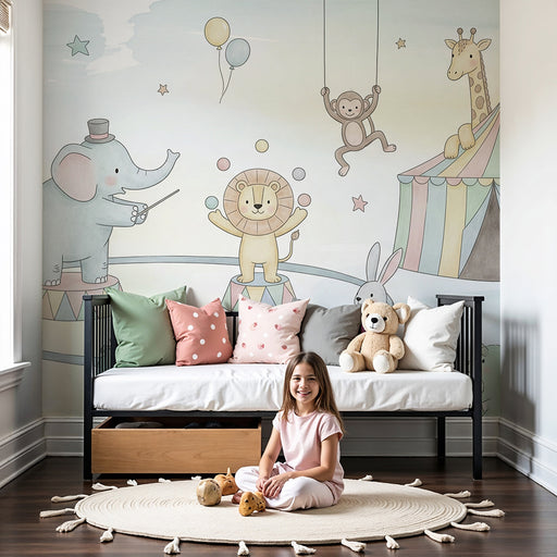 Mostrar todos os detalhesPapel de parede quarto bebê | Circo encantador com animais divertidos