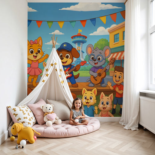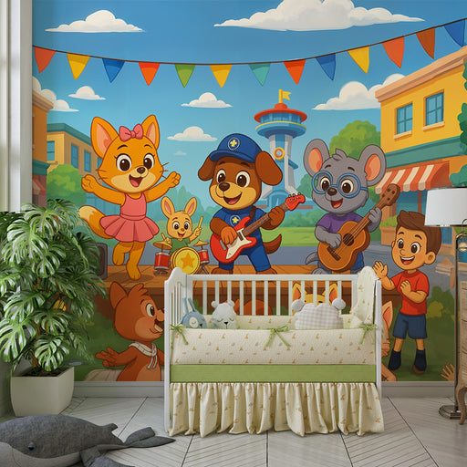 KidsWallEste papel de parede festival animal apresenta uma cena alegre com animais antropomórficos e crianças, ideal para criar um ambiente festivo e anima...