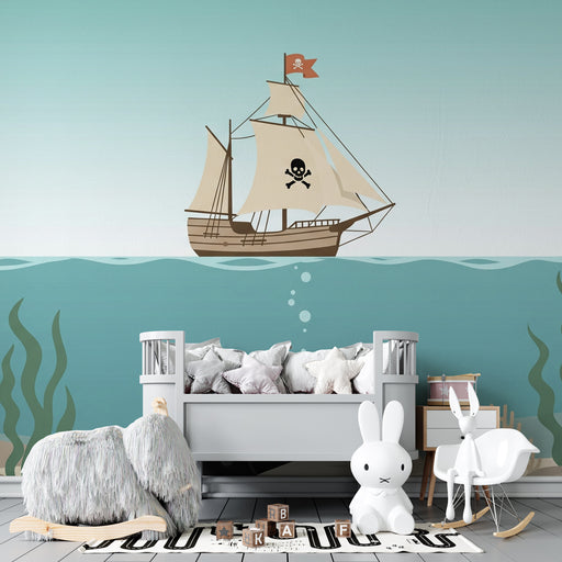 KidsWallEmbarque numa aventura marítima com este papel de parede para criança, ilustrando um navio pirata navegando em águas turquesa. Esta decoração cativ...