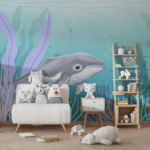 KidsWallMergulhe no fascinante universo do oceano com este papel de parede para quarto de criança que apresenta uma adorável baleia nadando entre os corais...