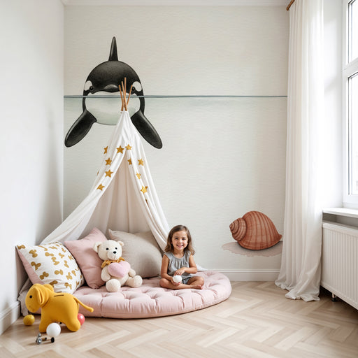 KidsWallMergulhe no mundo marinho com este papel de parede para criança ilustrando uma majestosa orca flutuando pacificamente sob a água. Rodeada por delic...
