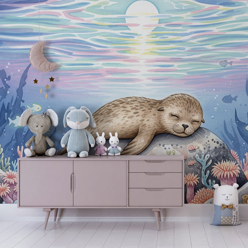 KidsWallMergulhe no coração do oceano com este papel de parede para crianças representando uma adorável foca descansando pacificamente em uma rocha. Rodead...