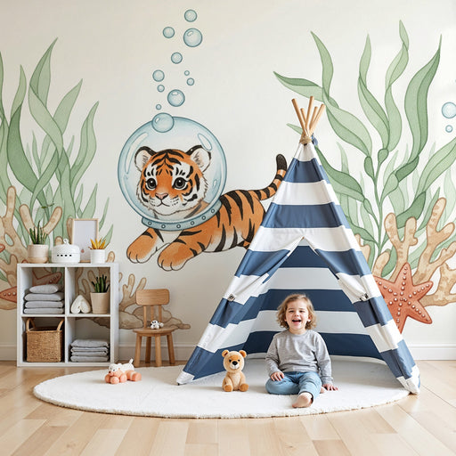 KidsWallMergulhe num universo subaquático mágico com este papel de parede para crianças apresentando um adorável pequeno tigre explorador equipado com o se...