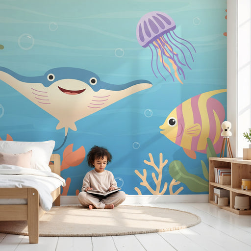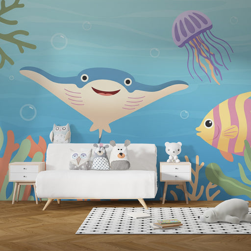 KidsWallMergulhe o seu filho num mundo aquático mágico com este papel de parede para crianças. Uma majestosa arraia nada graciosamente no meio de um vibran...