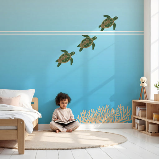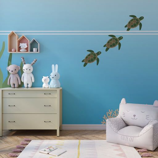 KidsWallMergulhe no universo calmante do fundo do mar com este papel de parede para quarto de bebê. Uma bela tartaruga nada calmamente na superfície da águ...