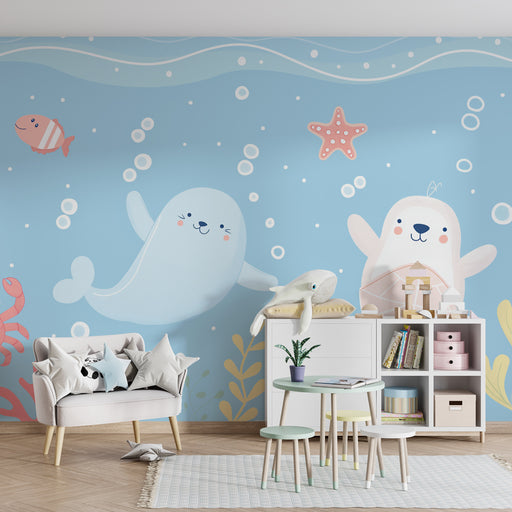 KidsWallMergulhe no encantador mundo marinho com este papel de parede para crianças que apresenta uma adorável foca rodeada pelos seus amigos aquáticos. Co...