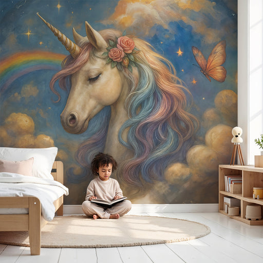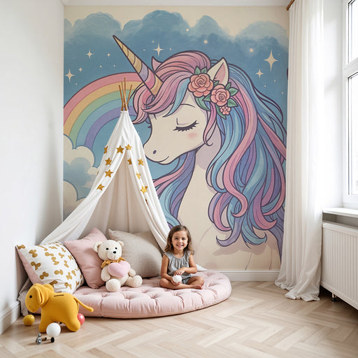 KidsWallPlonge num universo feérico com este papel de parede para crianças onde um doce unicórnio brilha sob um arco-íris pastel. O seu olhar pacífico e po...