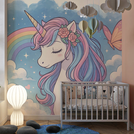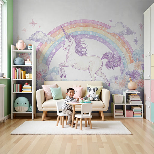 KidsWallTraga a magia para o seu espaço com o nosso papel de parede unicórnio arco-íris. Esta ilustração suave e pastel apresenta um adorável unicórnio pul...