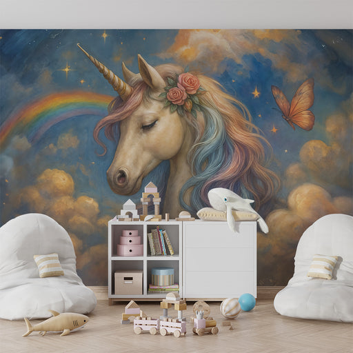 KidsWallPlonge num mundo encantado com este papel de parede quarto bebê onde um majestoso unicórnio parece emergir de um arco-íris brilhante. O seu olhar b...