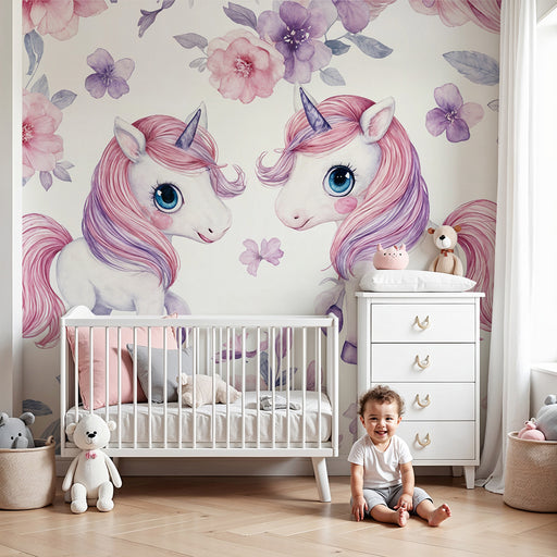 KidsWallEste papel de parede unicórnio apresenta duas adoráveis unicórnios rodeadas por padrões florais suaves, perfeito para dar um toque mágico e infanti...