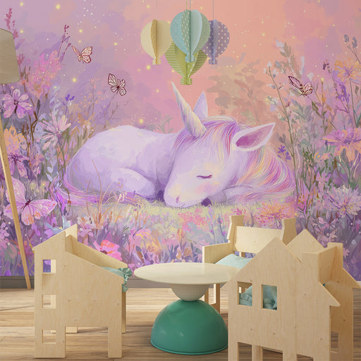 KidsWallEste adorável papel de parede apresenta um unicórnio adormecido num campo de flores em tons pastel, rodeado por delicadas borboletas. Ideal para um...