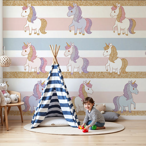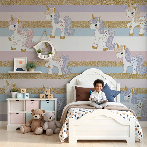 KidsWallTransforme o quarto do seu filho num verdadeiro reino mágico com este papel de parede para crianças representando um adorável unicórnio a trotar nu...