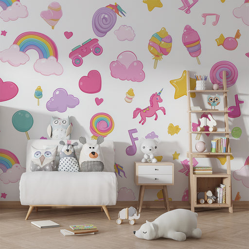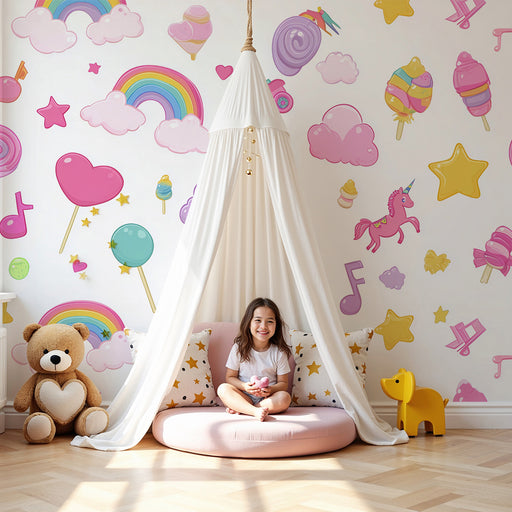Mostrar todos os detalhesPapel de parede arco-íris e doces | Design lúdico e colorido