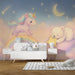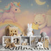 Transforme o quarto do seu filho com este papel de parede mágico representando um adorável unicórnio e um urso adormecido em nuvens suaves. As cores pastel e os elementos celestiais, como estrelas e arco-íris, criam uma atmosfera serena e onírica, perfeita para um espaço cheio de sonhos.