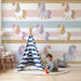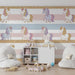Este papel de parede de unicórnio apresenta adoráveis padrões de unicórnios em tons pastel brilhantes. Perfeito para um quarto de criança ou uma sala de jogos, inspira magia e imaginação com suas cores suaves de rosa, azul e dourado.