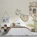 Transforme o quarto do seu bebé num casulo suave e calmante com este papel de parede para bebé encantador, apresentando um adorável preguiça pendurada num ramo, ao lado da sua cabana de madeira. Esta decoração inspiradora convida à contemplação enquanto traz um toque de natureza para o quarto.