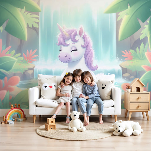 KidsWallTransforme o quarto do seu filho com este papel de parede encantado que apresenta um adorável unicórnio à beira de uma cascata brilhante. Imersa nu...